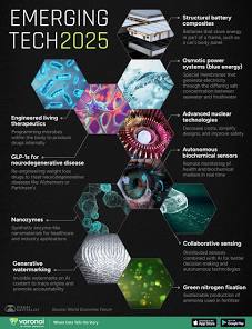 In 2025, top emerging technologies focus on AI integration, biotech breakthroughs, and sustainable solutions, with key areas including Agentic AI & Generative AI, Quantum Computing, Biotech (Engineered Therapeutics, Nanozymes, GLP-1s), Advanced Energy (Nuclear, Osmotic), Edge & Ambient Computing, Advanced Sensing (Autonomous Biochemical), Cybersecurity Mesh & AI Governance, BCIs (Brain-Computer Interfaces), and Structural Battery Composites, aiming to solve climate, health, and digital challenges. Here are some prominent emerging technologies for 2025, drawing from expert reports.