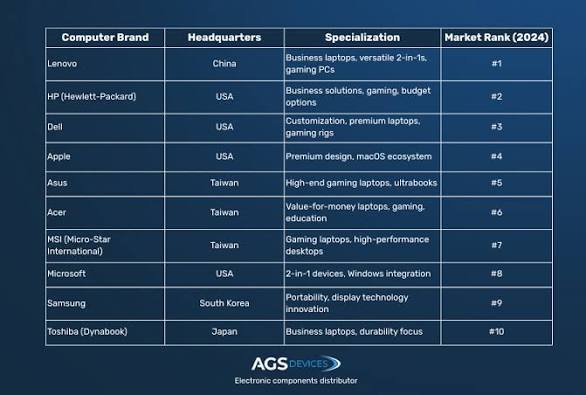 • Lenovo (Approx. 23-27% market share): Known for its durable ThinkPad business laptops and versatile IdeaPad consumer line.