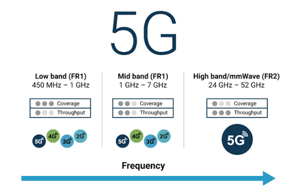 • Mid-band 5G transmits between 1 and 6 GHz.